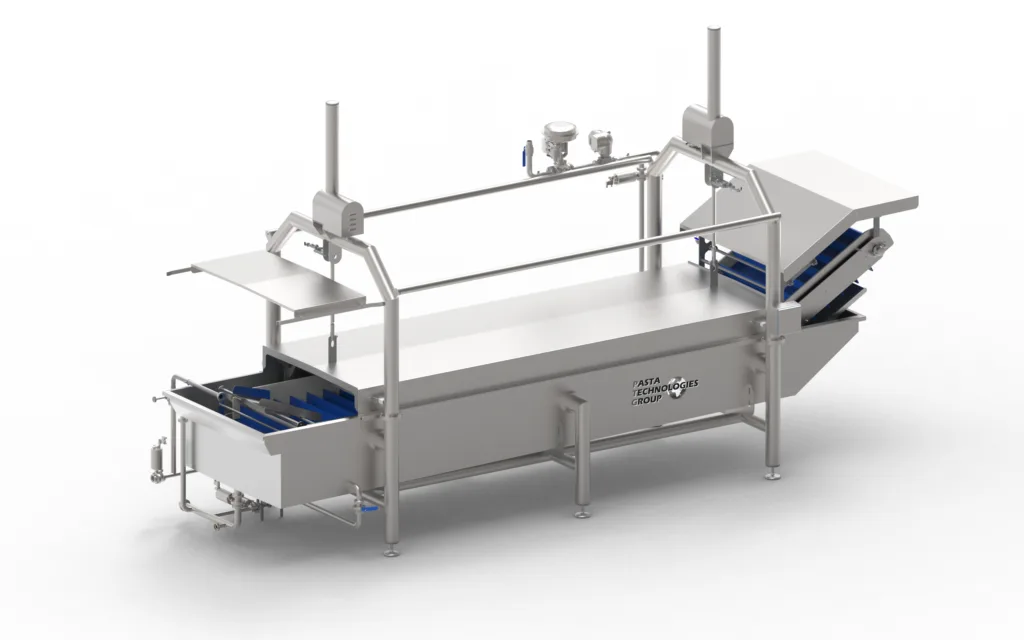 The immersion cooling tank is designed for the rapid and efficient cooling of spätzle, gnocchi, short and long pasta, filled pasta and pasta sheets, ensuring a gentle and uniform treatment of the product.