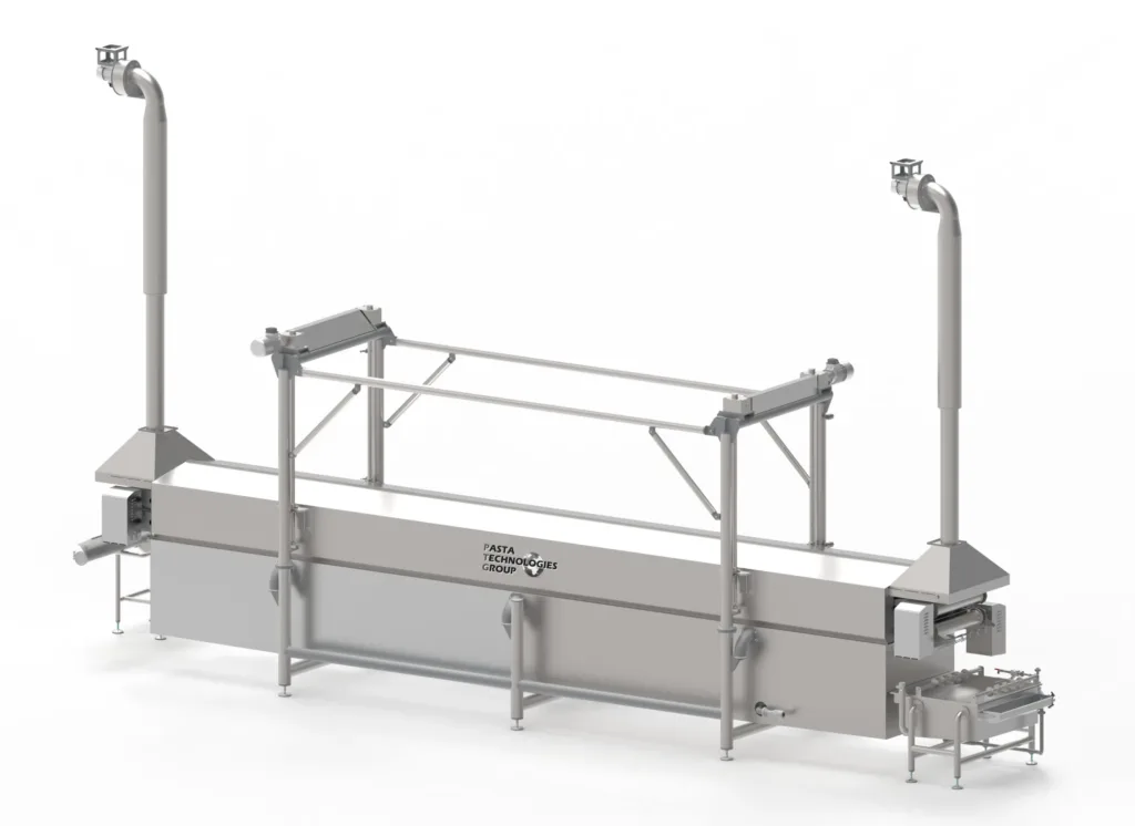 The product moves forward immersed in water at a temperature close to boiling point, and thanks to a precise temperature control system, a uniform and controlled pre-cooking process is achieved.
