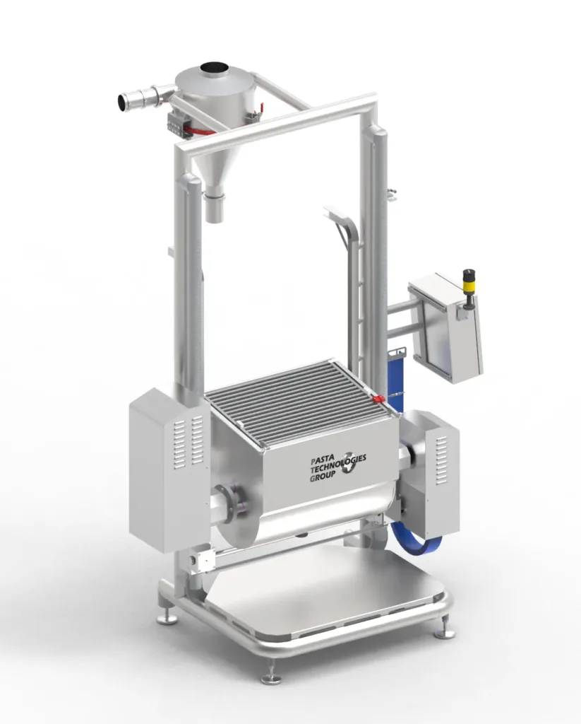 Batch mixer designed to ensure deep and homogeneous blending of flour and semolina with water, eggs, and emulsions. The stainless steel structure, combined with reliable components, precise mixing time control, and a bowl lifting and tilting system, ensures consistent performance, ease of use, and high production efficiency.
